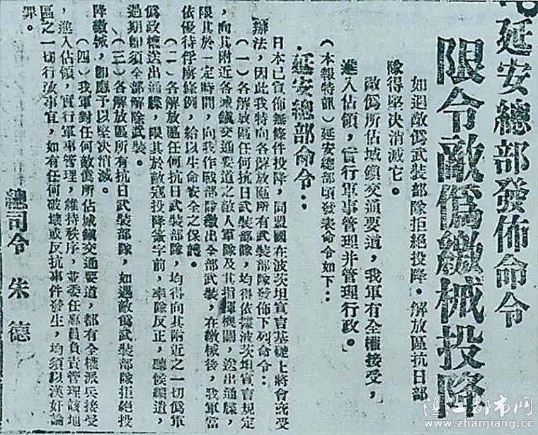 1945810日,朱德发布命令,限令日伪军缴械投降。图为当时的报道。