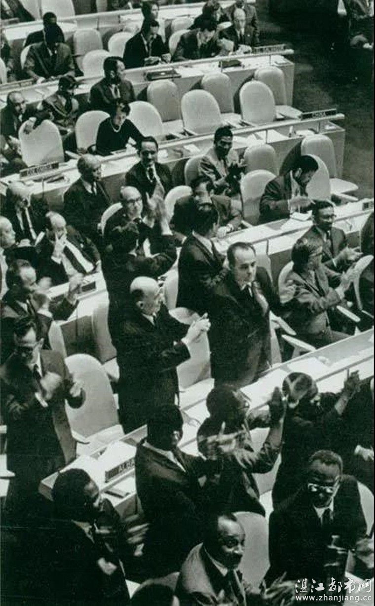 1971年10月25日,第二十六届联合国大会通过决议,恢复中华人民共和国在联合国的一切合法权利。图为决议通过时,会场一片欢腾。