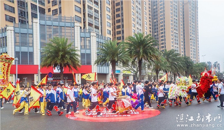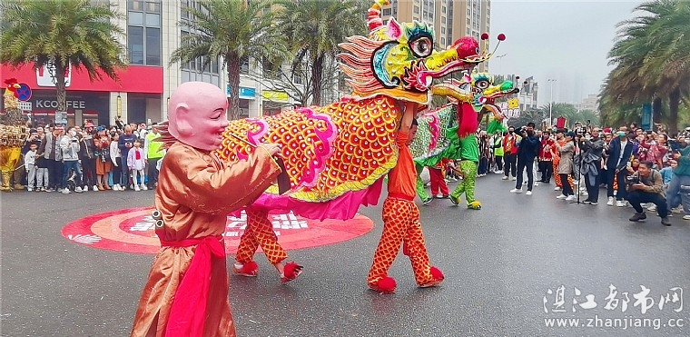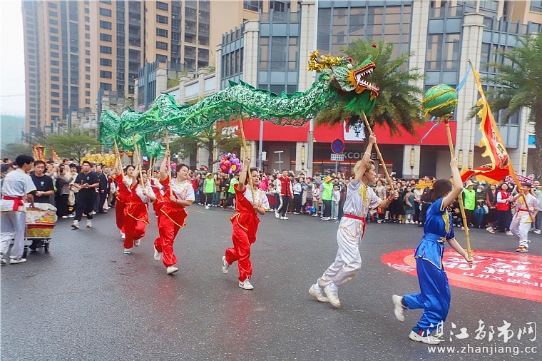 当天上午,本次文化节的非遗巡游队伍由军鼓队、龙狮队、网龙队、少林武术队、麒麟双鸡队、英鹰雄队、英歌舞队、飘色队和游鱼队组成。非遗巡游队伍浩浩荡荡地从君临华府出发,沿华附幼儿园、市民广场、东盟国际车城、草苏村口、东盟城二期南门到市民广场巡游展演。其中,调顺网龙、北坡游鱼、文章湾簕古龙、遂溪醒狮、湛江人龙舞、雷州蜈蚣舞和吴川飘色等湛江本地非遗民俗展演。鼎能集团还特邀获得国家民间文艺“山花奖”的潮汕普宁泥沟英歌队、潮汕麒麟舞、双鸡舞一起同台献艺。拥有数百年历史的普宁泥沟英歌舞、网红“小时迁”的精彩表演更、独具特色的潮汕麒麟舞和双鸡舞,粤东、粤西非遗文化的激情碰撞,吸引沿街的市民、游客驻足观看。