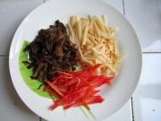 起锅于热油中下入肉丝,划散炒熟盛盘。