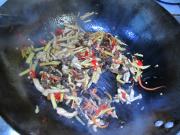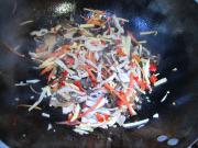 下入胡萝卜丝、木耳丝、冬笋丝翻炒。