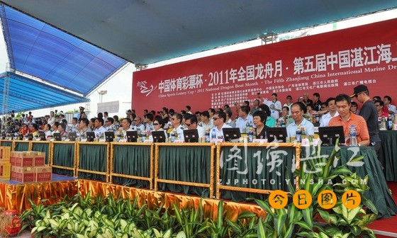 碧海银沙网讯(图文/黎 明 编辑/小 雨 云 海)6月6日下午2点,“中国体育彩票杯” 2011年全国龙舟月?第五届中国湛江海上国际龙舟邀请赛在在美丽的海湾城市广东湛江金沙湾海畔开幕。市领导李康寿、严植婵、邓碧泉、麦教猛、陈亚德、刘菊、柯明、李连、周车平、梁志鹏、杨标、廖旭材等四套班子领导,香港龙舟总会主席陈镜清,原湛江市四套班子有关领导及市有关单位、驻湛有关单位、驻湛部队领导等领导嘉宾参加开幕式并在主席台就座。中共湛江市委副书记、政法委书记严植婵鸣锣并宣布龙舟赛开幕,湛江市委常委、常务副市长王中丙致开幕辞,副市长梁志鹏主持开幕式。