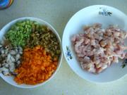 将香菇、胡萝卜、榨菜、青豆、肉切成小丁。