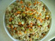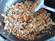 等肉转色后,加入胡萝卜,青豆,榨菜跟香菇丁再翻炒,最后加入酱油调味,关火即可。