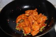 红尖椒切碎,爆香后翻炒虾。加调味料后出锅。