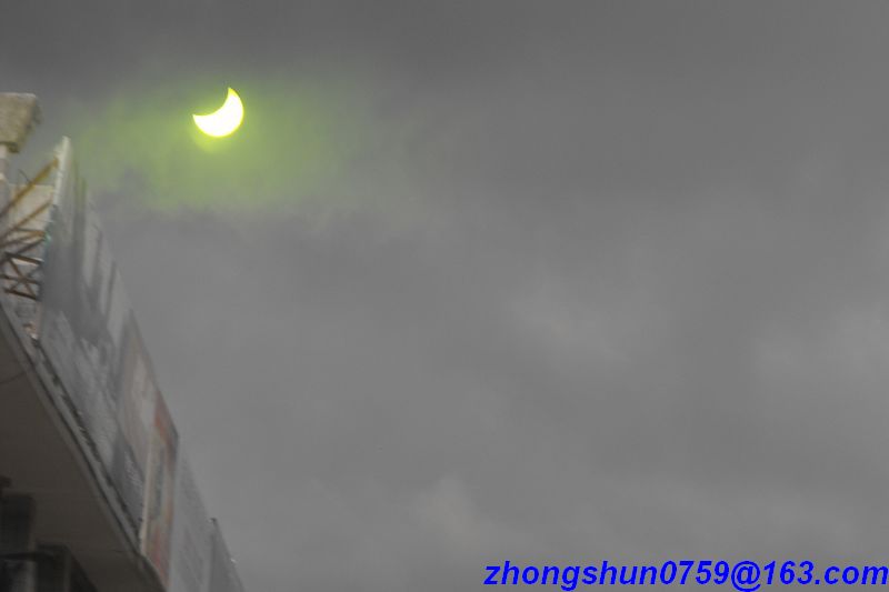 日(月)食,作为一种天文现象,古人称为天狗食日(月)或天狗咬日(月)。 据说本次日食,是500年一遇,呵呵,500年一遇都被遇上了,看来今天得买上几注双色球彩票。 虽不是天文爱好者,但毕竟在家门就可以看到,还是就地取材吧,听说电焊眼罩也可以观看了,虽然还没开始,但拿来焊镜对着太阳一看,呵呵,效果相当不错嘛。 以下是随手拍下来的相片,与大家分享,分享那500年一遇的兴奋与快乐。 拍摄地点:海田五金机电市场第九行 拍摄方法:对着电焊眼罩拍反光相片或者直接透过眼罩,设置为夜景模式,遗憾的是当时拍摄时,没有调整好时间,在相片里没有时间记录。 ![]() 滤光后的蓝天白云 ![]() 夜景模式下拍摄的蓝天白云 ![]() 享受家门口上的蓝天白云 ![]() 色镜后面的别样阳光 ![]() [此贴子已经被作者于2009-7-22 17:09:52编辑过]