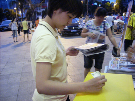 一位热心的市民,问了大家吃过饭了没,坚持要把大家手上的报纸全部买走,好早点回去吃饭,此时正在清点报纸数量