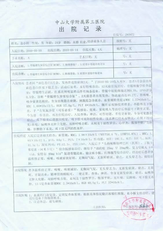 2010年3月5日,这突如其来的天灾幸运终于的降临到我身上了… 我去医院做完血常规检查 结果血小板显示:血小板一万二(正常人的血小板是十万到三十万) 血小板功能是止血 如果低就可能随时内脏出血 或者手不小心划破也会血流不止直到死亡!因此我被迫强行住进广州市中山大学附属第三医院,这一住就是几个月,花了几万块钱抽了三次骨髓 结果不如人愿 我确诊为“骨髓增生异常综合症”!开始我觉得这个病也就这样 我不敢告诉我的爸妈 朋友 因为我觉得很快可以好起来的的!但经过几个月长时间的治疗 发现仍然不见一点起色,直到上个星期六我的一次连续几天高烧烧到40多度 我以为那时我再也见不到我的 同事 领导 同学 亲戚 还有我的朋友们 但被我熬过来啦!这次终于都被我爸妈知道 她们都跑来中山医院 把我骂一顿 医生说“我这个病唯一的根治办法就是做 骨髓移植”这需要五十万左右的费用,是五十万 而不是五十块 也不是五万阿 这么大笔费一下子哪里筹啊…… 而且还要找到适合自己的骨髓… 不过我知道有一大帮的 同事 领导 同学 朋友 亲人在默默的鼓励 支持我 我一定可以渡过这个鬼门关的 我一定会好起来的!因为我还要再活五百年阿!现在我的最大心愿就是筹够钱 找到适合我的骨髓 然后尽快手术 因为不手续随时都可能有生命危险!亲爱的朋友们 你们不要怪我没及时告诉你们哦 因为我也不想你们为我担心!对了,你们一定要注意自己的身体啊 身体是革命的本钱哦!