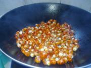 锅内倒入普通炒菜油量的菜油(用这个油比较香),菜油可以烧久一点,没烧熟会有味道,倒入虾尾炸,这一步很关键,虾尾炸好了才好吃。