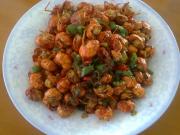 虾尾炸至9分熟后加入姜末蒜头小块桂皮豆瓣酱剁辣椒盐糖陈醋红尖椒(除青椒鸡精外的所有配料)翻炒均匀后放入少量水烹煮。