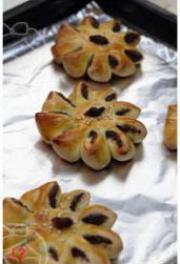 将豆沙包按扁,用切刀均匀将面饼周围一圈切开,整形成菊花状。