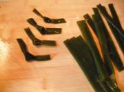 把买来的海带洗净,先切成条,再系成死结,像图2,这样海带吃起来更有口感;(系海带时由于海带表面较滑,所以应边冲水边系会好系些)。