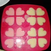 最后和那些奶片煮成的水混合在一块 分成两个小碗 一个我是要加粉红色的色素的 粉红的爱心嘛 (老公强烈推荐用好时巧克力做 )可是我不喜欢黑色的心 其他的模子倒是可以考虑噢。