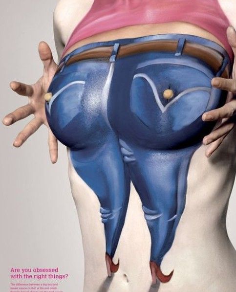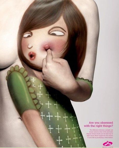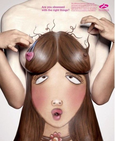 不要想歪了,这是一组新加坡乳腺癌基金会为宣传女性关注乳房健康而创作的一组人体彩绘。旁白是:“你关注了真正值得关注的事情吗?”