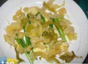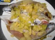 然后再撒上酸菜和酸菜汁,入锅蒸10分钟后,撒上葱丝,淋上热油,好吃又开胃的酸菜蒸虱目鱼肚就做好了。