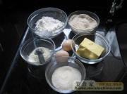 把材料准备好,椰丝250克,鸡蛋2个,奶粉4大勺,细砂糖100克,低筋面粉200克,黄油160克。