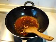 放入自制番茄酱略炒注入红葡萄酒50克煮开,再用黑椒汁盐调味。
