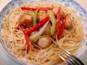 汤汁里放入海鲜小丸子煮透,汁收浓稠放入青豌豆和甜椒西芹。