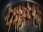 油锅烧热,加入串好的鸡翅尖,煎到微黄捞出。