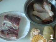 将五花肉和鸡腿洗净后,五花肉切1厘米见方的块鸡腿切块,土豆切块后放入清水里防止氧化变黑,葱切断,姜切片,蒜剥皮待用。