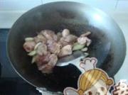 鸡腿肉变色后倒入去油后的五花肉。