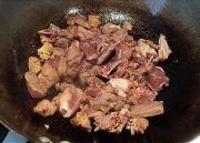 烧热锅倒入油先放姜片接着把腌好的鸭肉倒入大火炒。