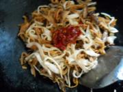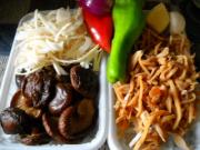 材料: 干香菇 10朵 干笋丝 干鱿鱼 若干 辅料: 青辣椒 1个 红椒 洋葱 少许 姜 一块 蒜 2瓣 调料: 油 2茶匙 盐 半茶匙 胡椒 少许 酱油 少许 郫县豆瓣 1茶匙