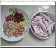材料包括:花生,眉豆,勾芡,沙参,姜片,红枣,鸡脚。