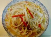 乌冬面 200克 瑶柱 20克 娃娃菜 100克 红黄彩椒丝各 15克 葱姜丝 适量 花雕酒(普通黄酒也可) 20克 鸡粉 少许 白胡椒粉 少许
