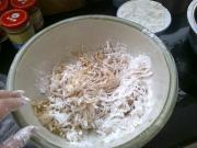 15分钟后,提上龙布的四角,把蒸好的拨烂子倒入准备好的盆里。