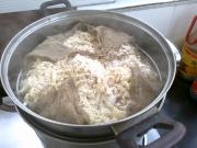 做水,沸腾,把龙布弄湿,不要拧,如上图,放入锅中。