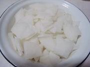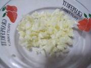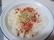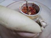 将腌过的萝卜控去水份,调入蒜米和干辣椒沫。