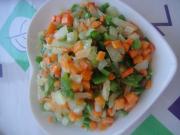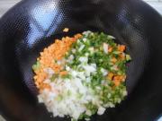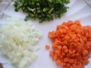 将胡萝卜、青椒、洋葱切小丁。