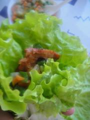 将几片生菜叶,放上肉片,然后再铺上些青菜粒,小心卷起。