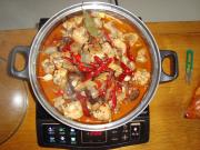 鸡块上色后倒入或多点开水,加入干红椒、香叶、八角、姜片、蒜瓣、枸杞五粒