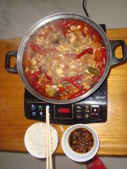 锅烧干,倒适量油,放入干红椒、姜片和葱头炸锅,根据食材放入郫县豆瓣炒出红油,放少量白糖,放香菇