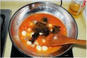 炒成泥状后加入高汤或水烧开后加入木耳、鹌鹑蛋。