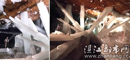 4、墨西哥巨人水晶洞 该洞位于墨西哥奇瓦瓦沙漠地下深处,洞深达1000英尺,洞内到处都是壮观的发光巨型石柱,有松树那么高,全部为半透明的金色和银色。晶体的形状令人惊叹叫绝。晶体形成于含有硫酸钙的地下水。由于地下一英里处是岩浆,在岩浆的不断加热下,含有硫酸钙的地下水从数百万年前就开始渗透整个洞穴,从而形成水晶洞。