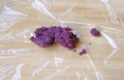 用一块保鲜膜摊开在手上,放入适量的紫薯泥。