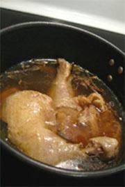 先下常温水放入锅,放几片姜、葱头,放鸡下锅,烧开后再烧两分钟左右,主要是去泡沫;另起锅倒入自制汤料,烧开,放入鸡块,水最好刚没过鸡的表面,时不时反转下。