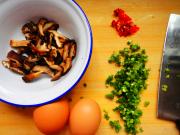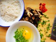 把香菇干泡好切丝,葱切末(要放入蛋液中所以细一点比较好),我一个人吃,所以后来只用了一个蛋、比较喜欢吃辣,但是有点上火,所以就放了一点。