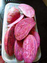 紫薯洗净、切两半,同面糊一起入锅蒸熟。