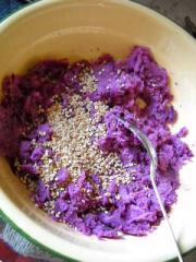 将小剂子团圆、压扁成面皮,再在中间包上紫薯馅,用大拇指和食指轻轻向上推饼皮至完全和拢。