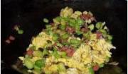 倒入焯好的蚕豆 香菇碎 火腿碎。翻炒。