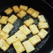 锅内多放些油,放入豆腐,煎到两面金黄,表皮微微褶皱即可。