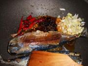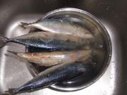 将冷冻的沙丁鱼放入清水中解冻(图为四条鱼2条用作其他菜)。