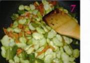 材料:蚕豆200克,雪菜100 克,肉末50克,青椒1个,干红椒3个,胡萝卜少许,葱姜蒜适量。蚕豆去老皮,雪菜洗净沥水,青椒胡萝卜切丁。