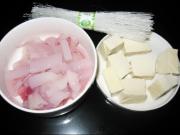 鱿鱼须洗净并沥干水分,北豆腐切麻将块,在加了盐的开水中焯一下,沥干水分备用。粉丝一小把。