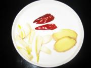 准备姜、蒜瓣、干红辣椒备用。