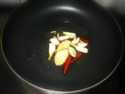 起油锅,爆香蒜姜片和干红辣椒。